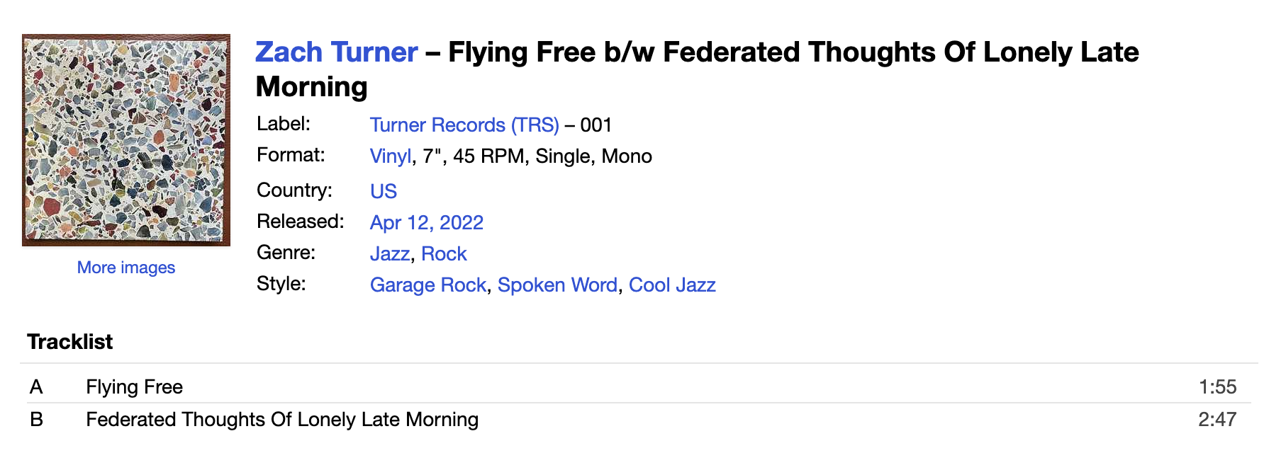 On April 12,2022 Turner Records (TRS) released its first product (001) as a 7″ single with two tracks by Zach Turner ranging in style from Garage Rock to Cool Jazz.